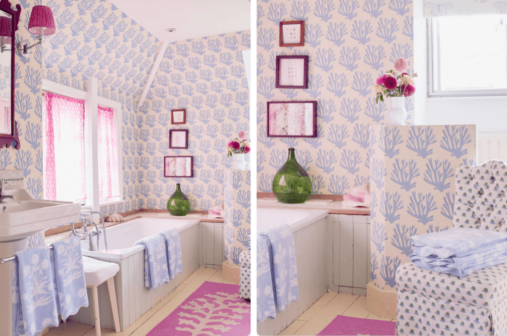 Can you give us a glimpse into the process of bringing this beautiful bathroom together? It started with the fun coral wallpaper and then became an obvious spot for my shell collections and little framed shell collections I have collected on my travels. I wanted the bathroom to feel soft and comfortable as had three children to bathe when we first moved here, so added an armchair, a rug from India, soft fabric lampshades and piles of books. Piles of fresh towels and jars of delicious bath salts add to make this room a space one really wants to spend down time in.