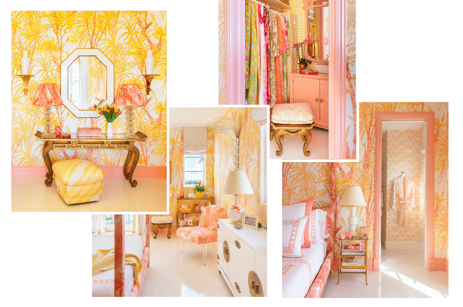 For the 2019 Kips Bay Show House, Palm Beach I designed a bedroom, bathroom and closet. The inspiration and name for the bedroom was the “Sunrise Jungle” drawing inspiration from Palm Beach, and the gorgeous sunrise views the room enjoyed. We designed a new colorway of our Rainforest wallpaper in shades of pink, apricot and yellow, and then coordinated papers for the closet and bathroom.