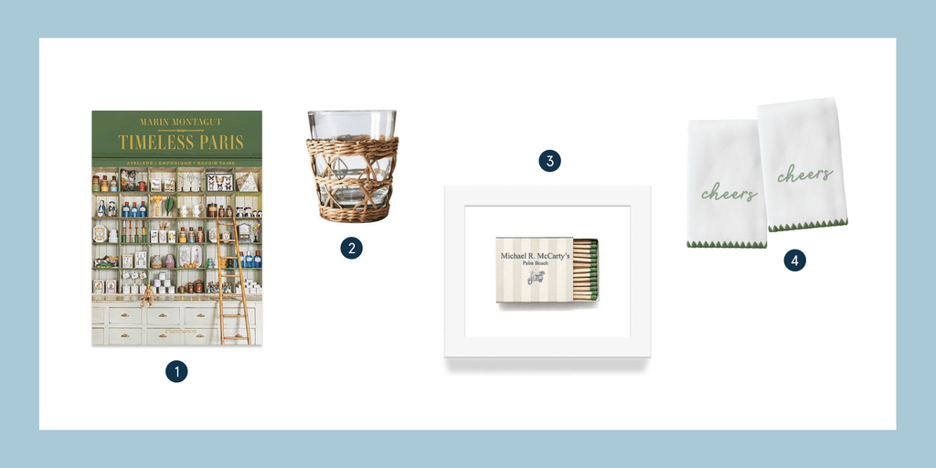 1. Timeless Paris Coffee Table Book  2. Rattan Tumbler  3. Matchbook Diaries  4. Powder Bath Towel (Green cheers)