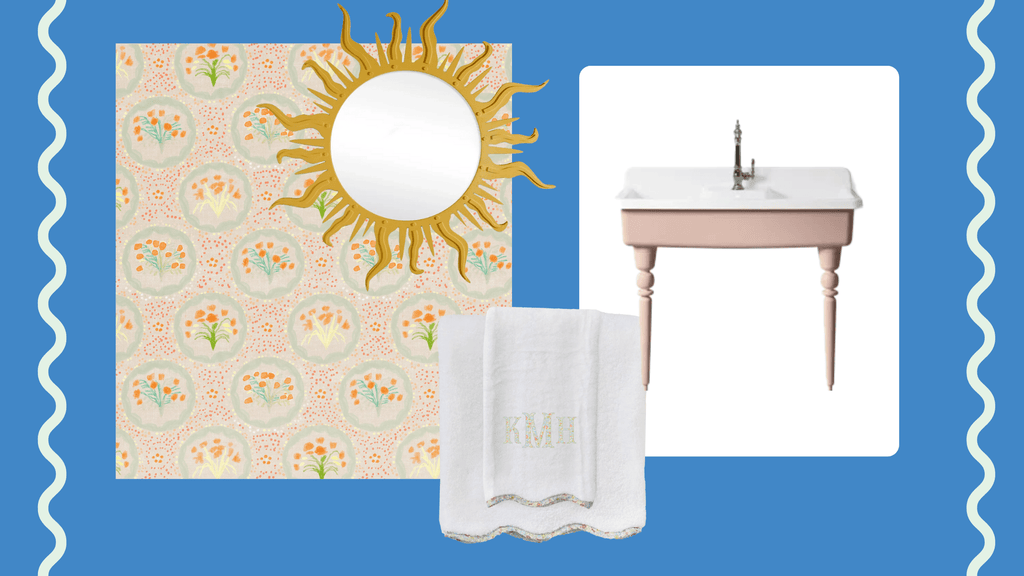 Monica Orange Burst Wallpaper: Carnival Flambeau Circle: Betsy Ann Scallop Towels: Farmstead Transitional Legs