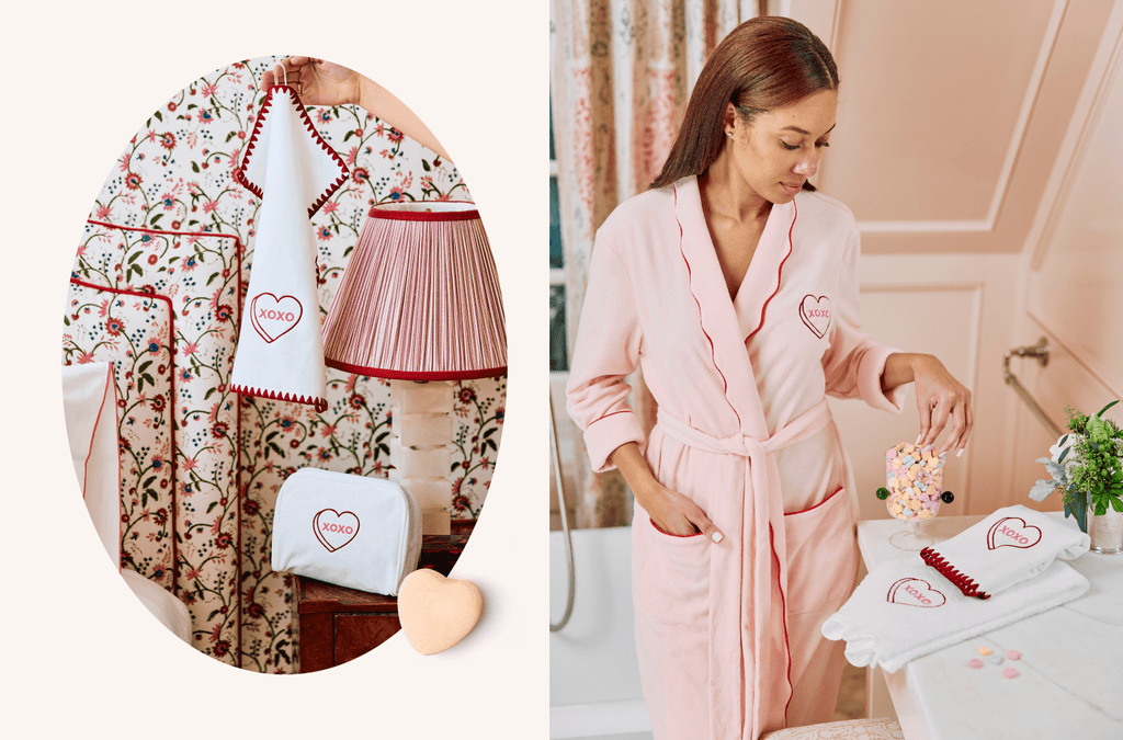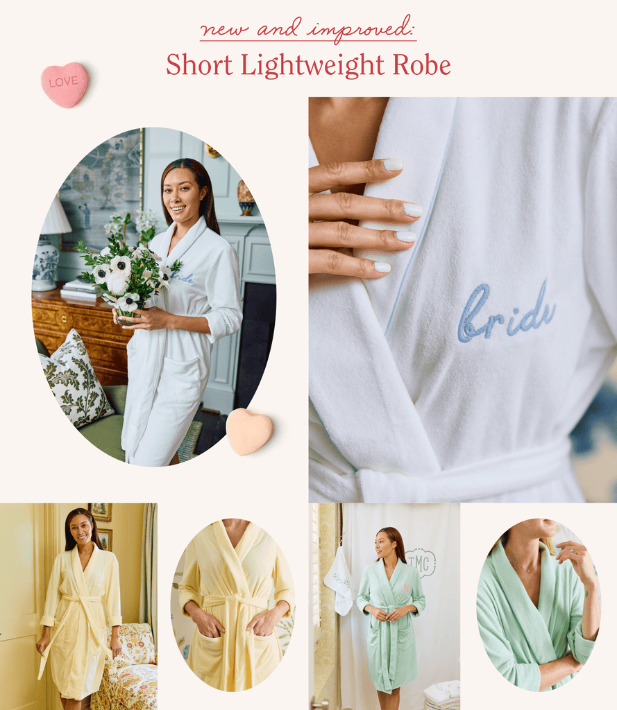 For lovers of all things luxe, shop limited-edition Lightweight Robes inspired by the season’s quintessential treat, conversation hearts. Darling pastels adorn two silhouettes: a debut straight-edged short robe, and our beloved scalloped-edged midi style:
